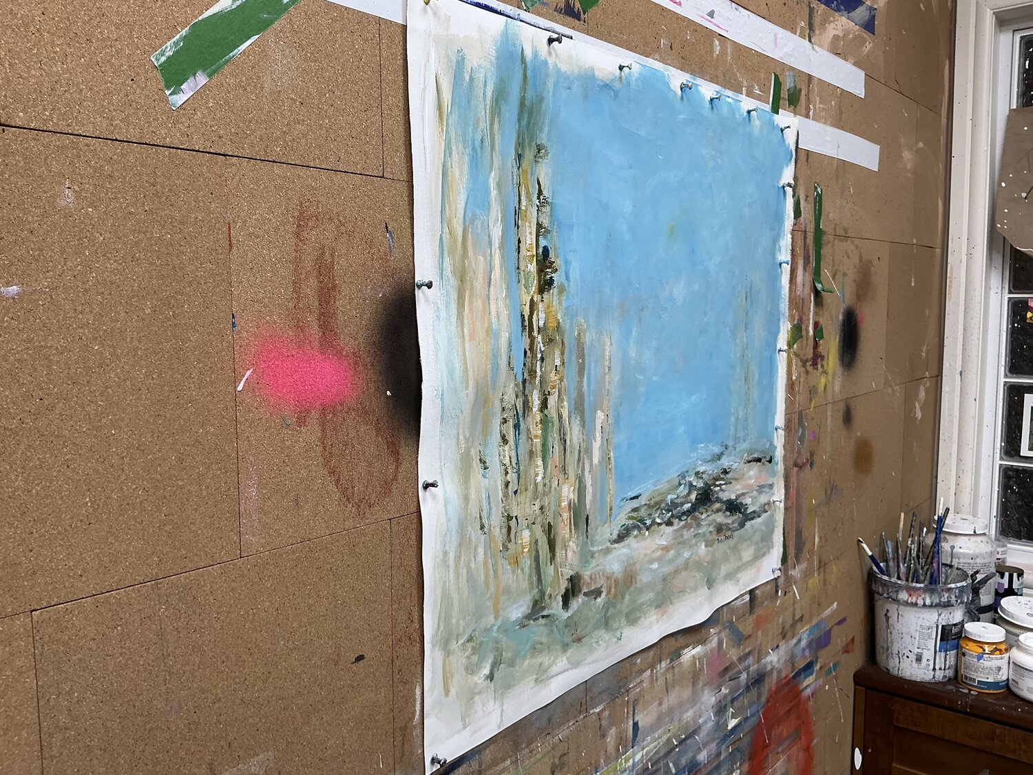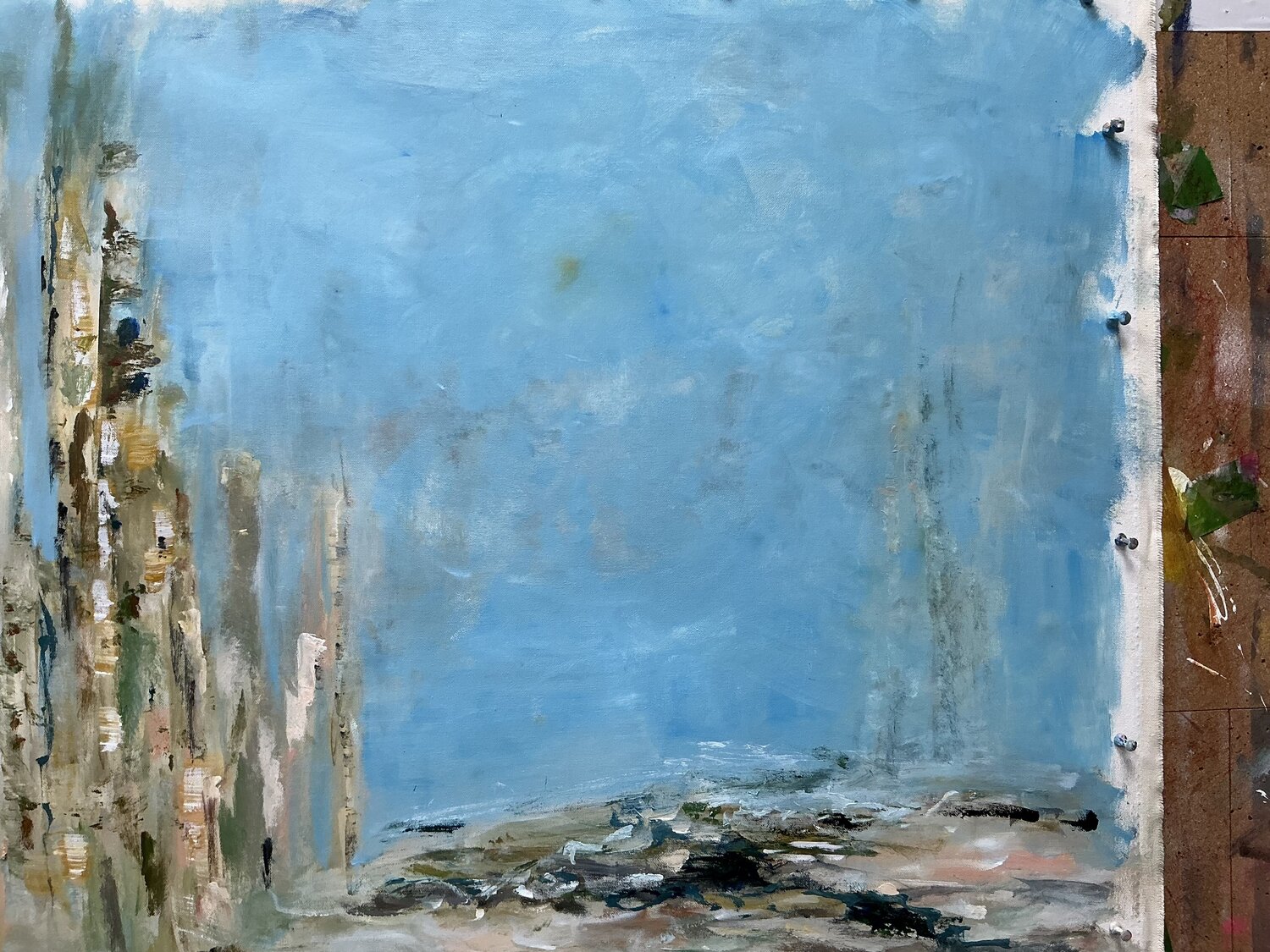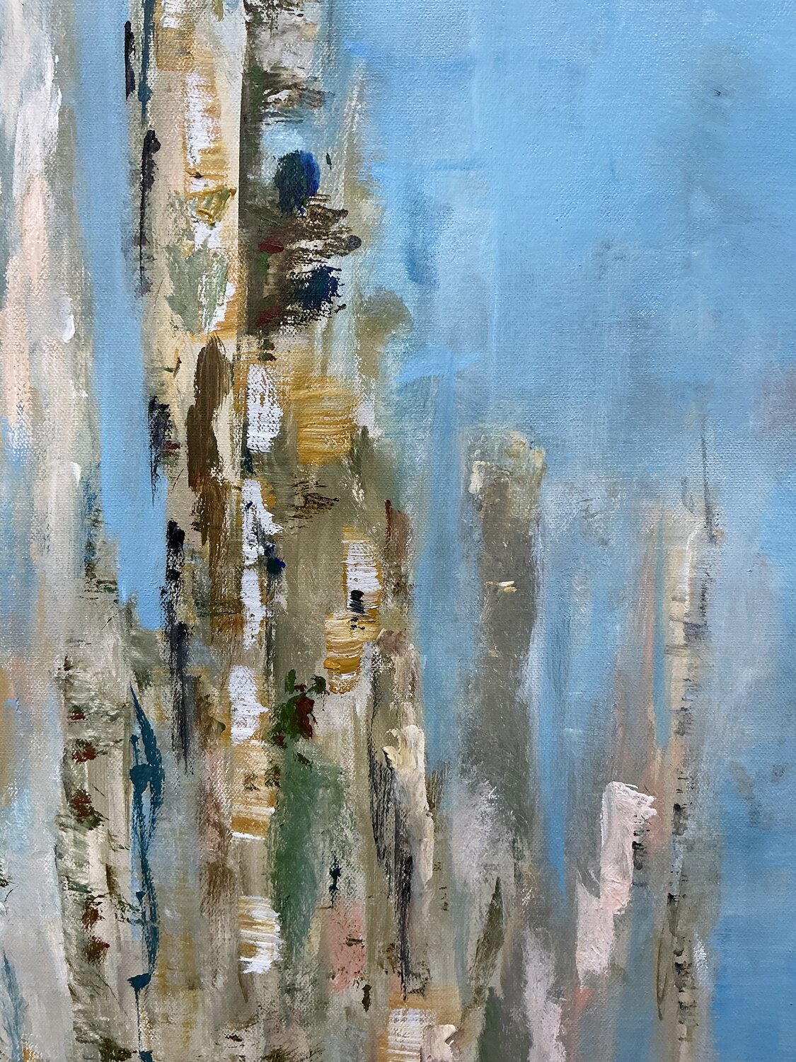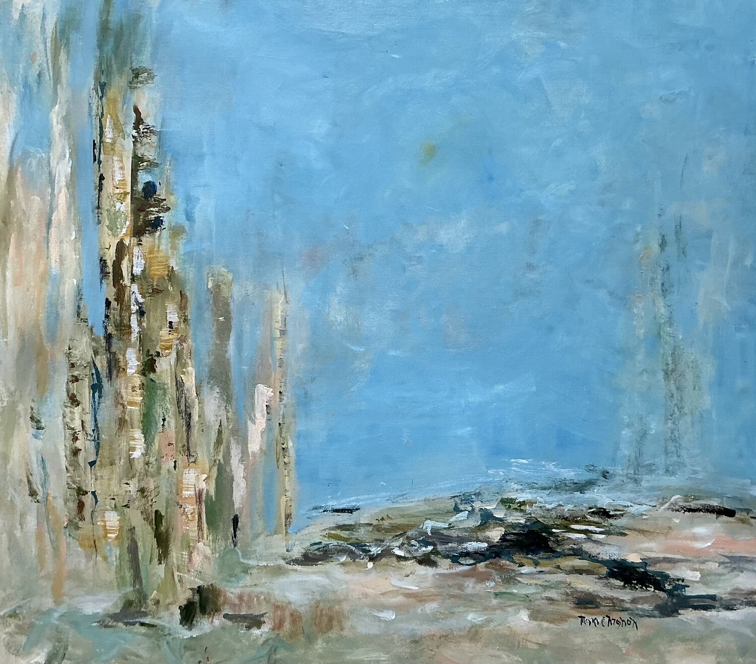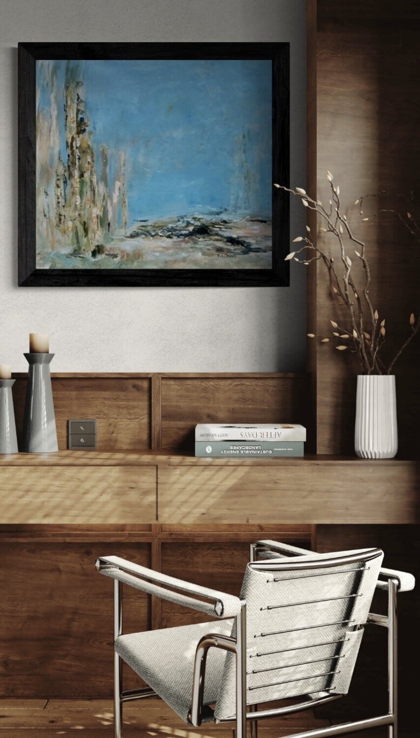 I wasn’t trying to paint a landscape, but a feeling — that space we all need when life feels full, noisy, or heavy. A place where the mind slows down and the body can breathe again. The vertical forms suggest presence, memory, maybe traces of what once was. The open sky holds space for calm, reflection, and stillness. Everything is intentionally soft, layered, and grounded, inviting you to rest your eyes and your thoughts.