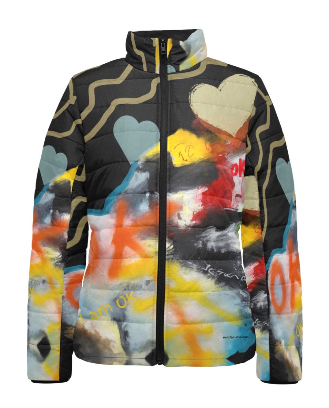 This Women's Stand-Up Collar Padded Jacket features prints from Marie Manon Corbeil's original paintings, transforming fashion into a canvas of vibrant artistry.