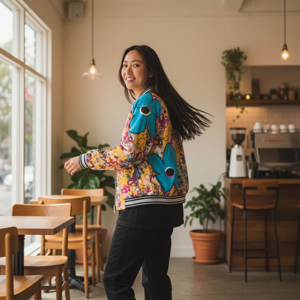 With its modern boho attitude and expressive composition, Blue Soul feels free, soulful, and unapologetically different. The structured bomber cut contrasts with the softness of the artwork, creating a jacket that feels both grounded and wild.