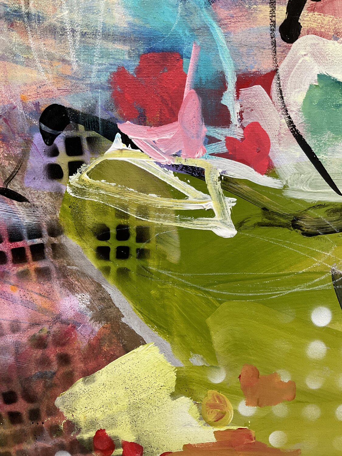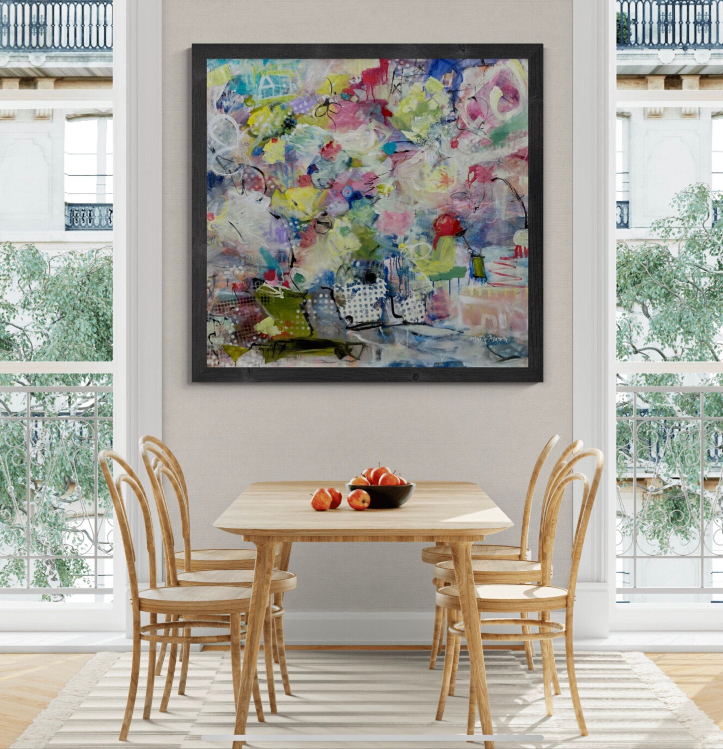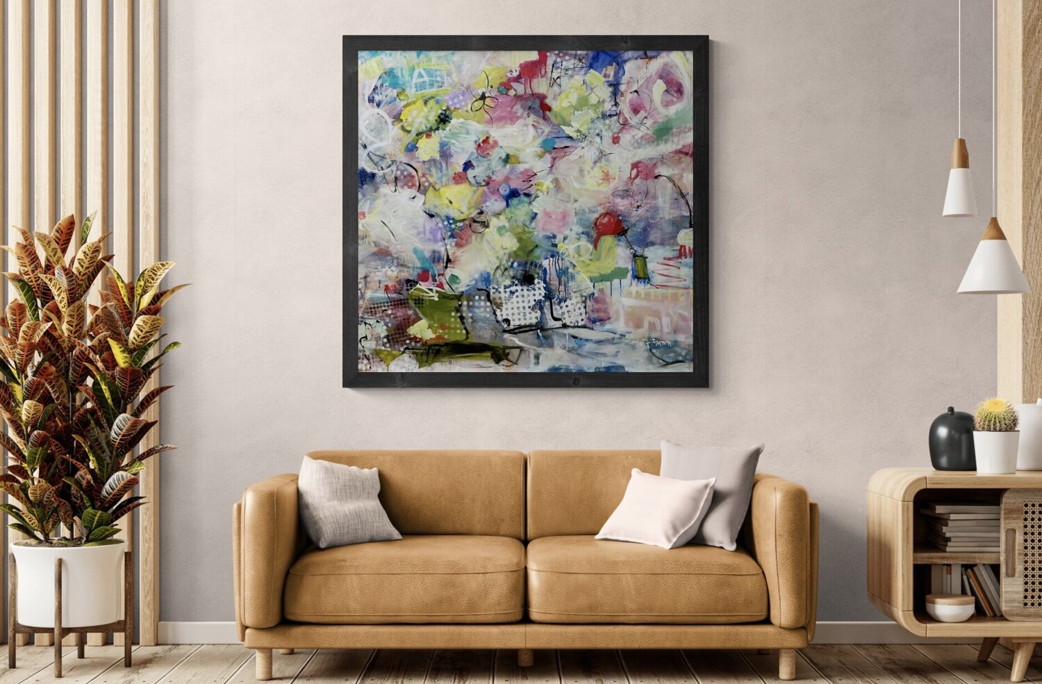 When shipping to Canada or the continental United States, the artwork will be mounted on a 1.5" gallery frame with the painted canvas wrapped around each side, and will be professionally packaged.