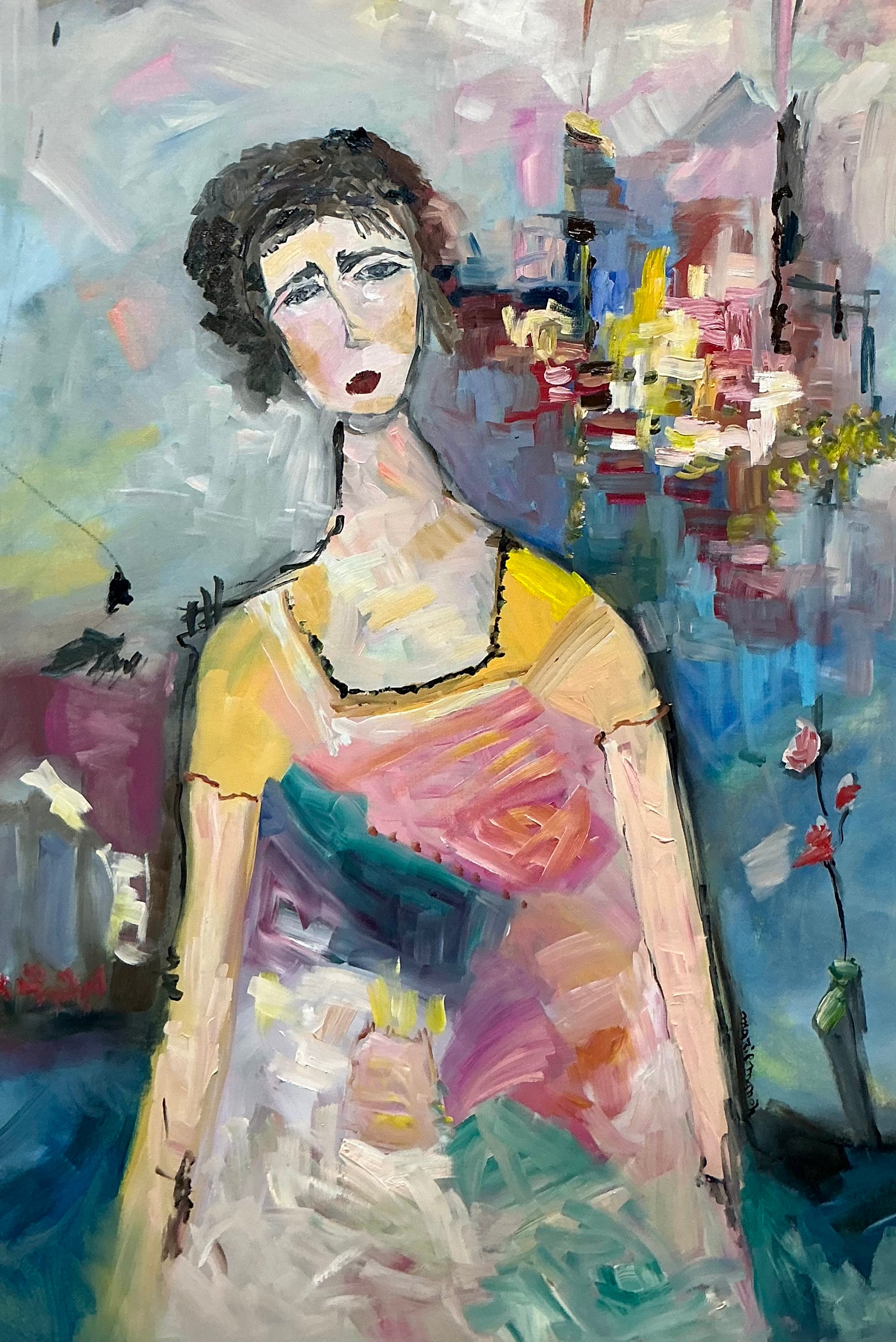 The woman in this portrait feels thoughtful and slightly distant, as if she belongs to two worlds at once. Behind her, the city unfolds in vibrant color, while her expression remains calm and grounded, holding onto memories of home.