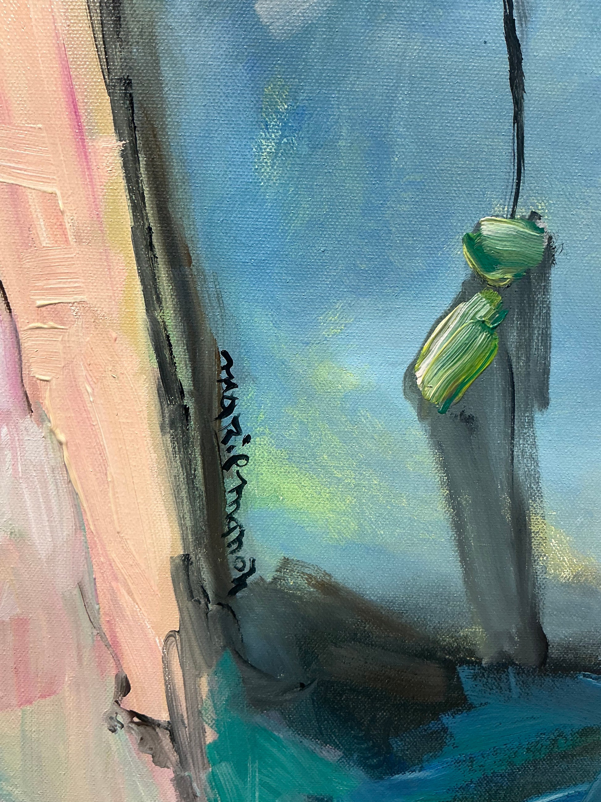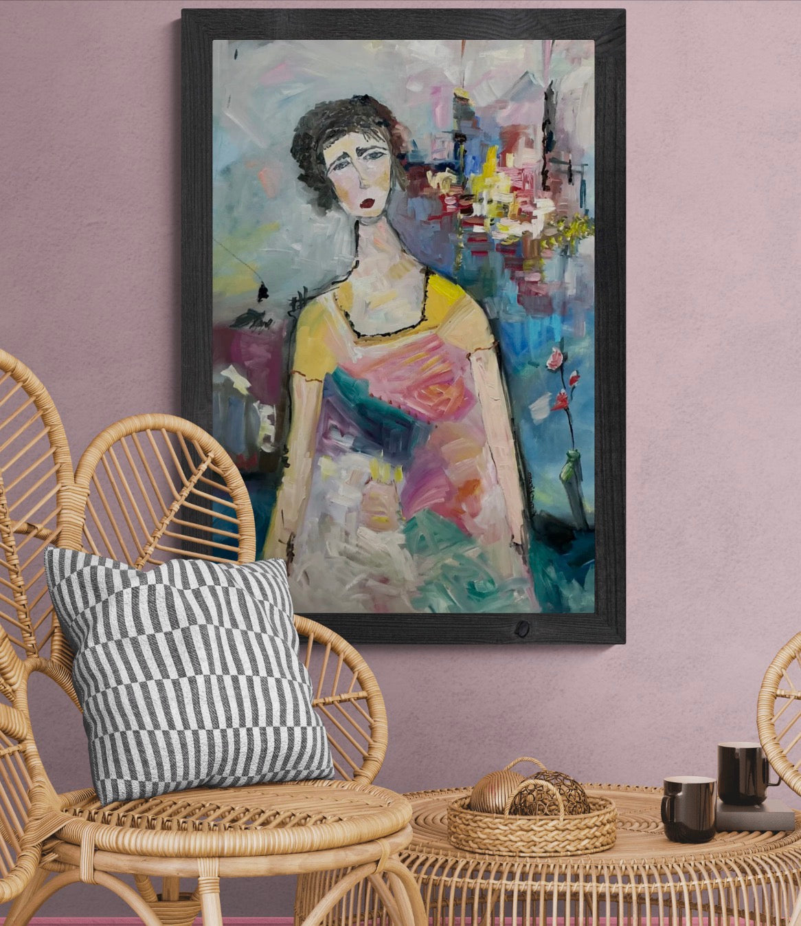 This painting is rooted in nostalgia, I was raised in a small village, surrounded by quiet streets and open skies. Now living in a big city, I often miss that gentle rhythm and simplicity. La villageoise en ville reflects that inner feeling — carrying the spirit of the village while standing in the movement of urban life.